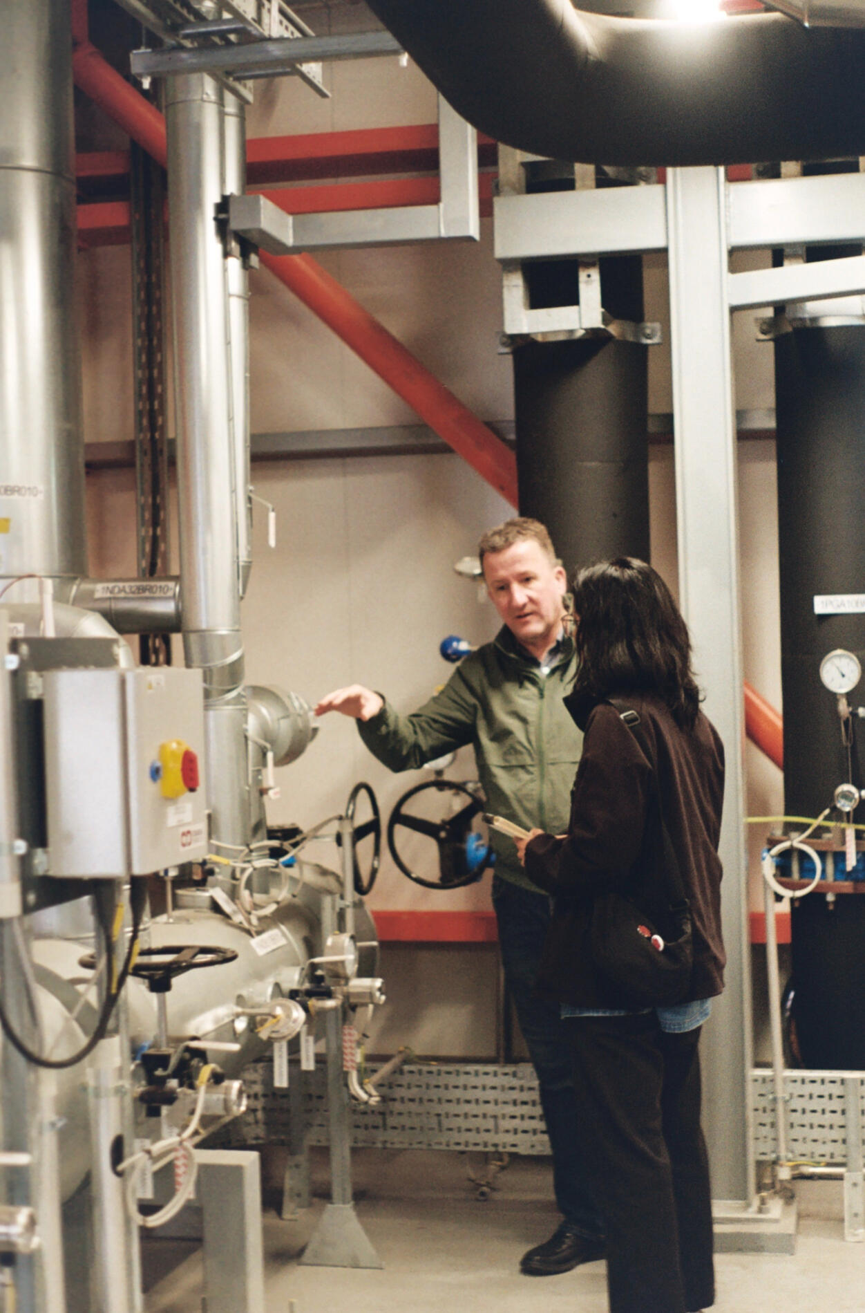 Interviewing a heat network professional, in the energy centre. (Photo by Stephanie Strifert, 2024.)