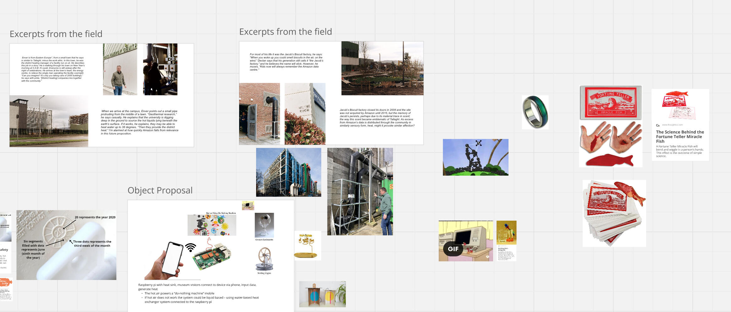 For this research project, I travelled to Tallaght to a examine the data centre waste heat network as it warmed public buildings. I conducted contextual inquiry, interviews, and participant observation with heat network professionals and recipients.I synthesized my field notes and interview data into a written output: a speculative ethnography of the cultural perceptions, and changeable future, of the data centre at Tallaght's heart. Read the ethnography here.In addition to my field research on Tallaght's heat network, I also conducted a series of online in-depth interviews with Low-Tech Magazine, a team of designers working on a solar-powered website. Read the article here.For the design phase of the project, I recruited and led a team of two designers in a series of in-studio design workshops. Together we prototyped and iterated several cultural probes objects, which were meant to materialize my findings from the field and engage the public at the Design Museum.