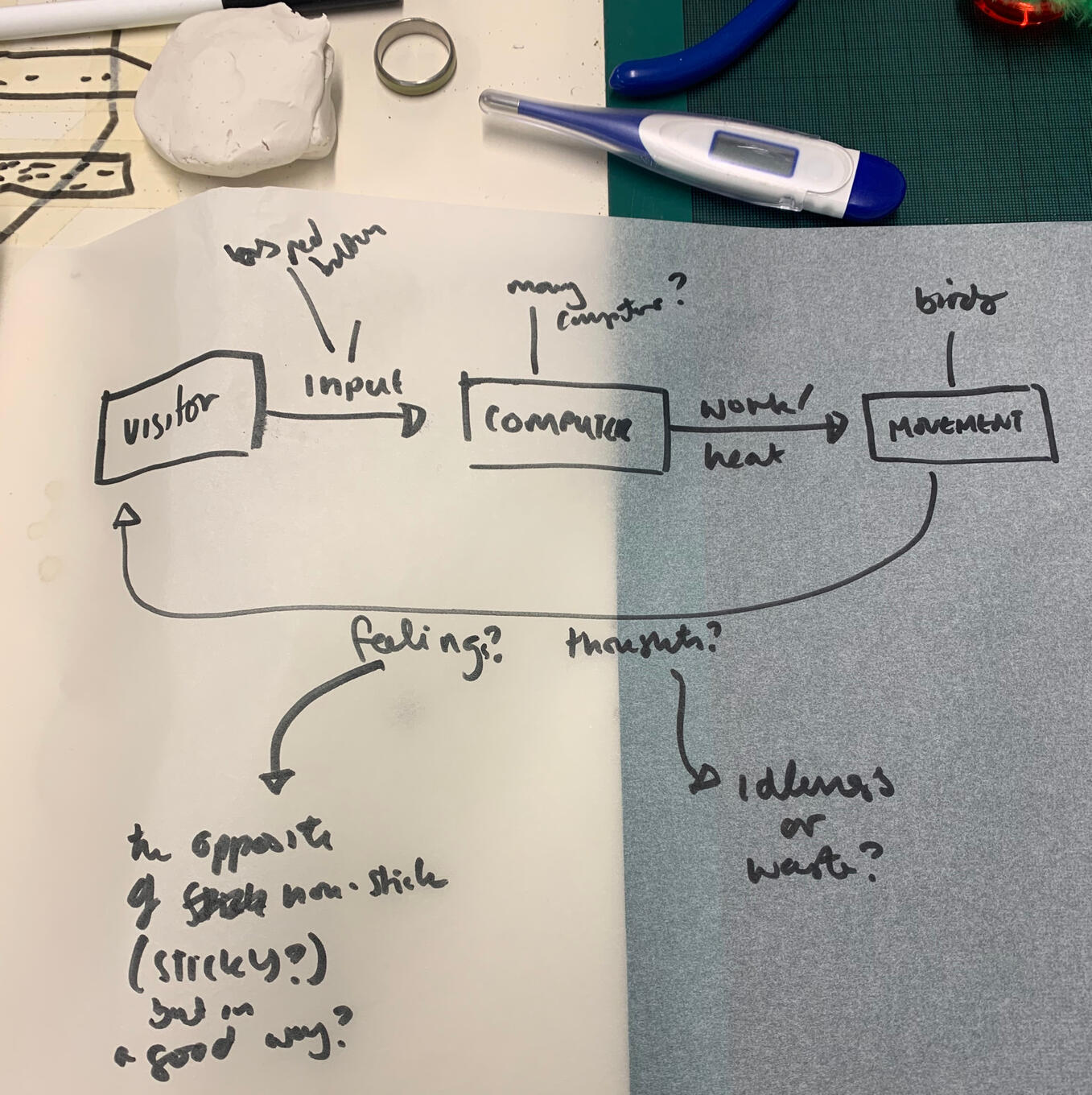 I contracted illustrator Leyla Salih to create a systems illustration explaining how waste heat from a data centre is transformed into public heating. I sketched out a map of the system, loosely based on Tallaght's heat network for Leyla to then adapt into an isometric illustration. I called this piece a "digital heat network," and made sure the image would be relatable and clear to the average museum-goer.