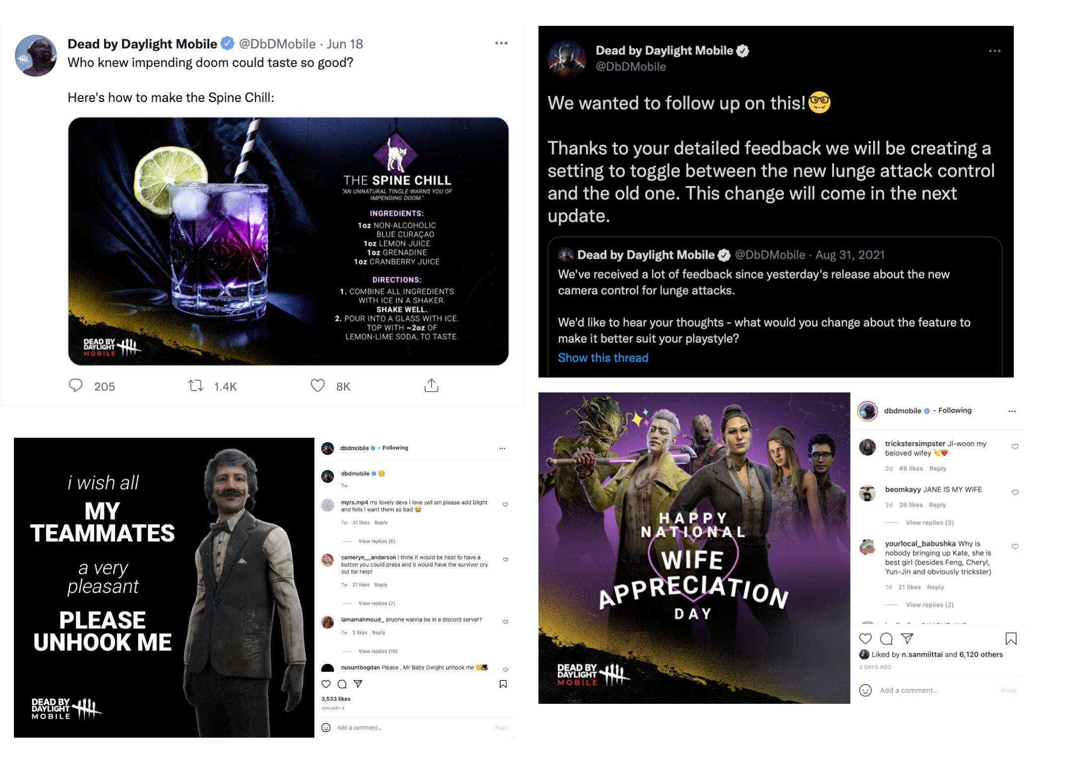 Some of the posts I made for Dead by Daylight Mobile; words by me, artwork by Cameron Sisco.